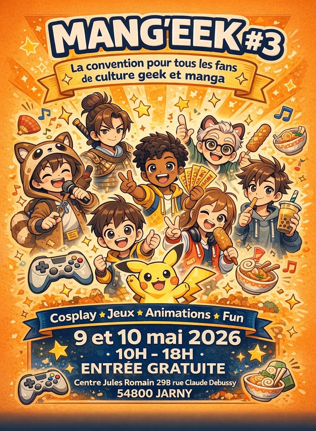 Les 9 et 10 mai 2026, Mang’eek revient au Centre Jules Romain à Jarny pour une 3ème édition.🎋 Entre cosplay, quizz, blind test, jeux... impossible de s’ennuyer !